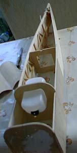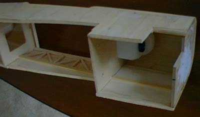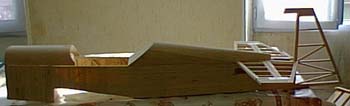 Collez ensuite les deux autres couples et cintrez le fuselage en surveillant l'alignement des couples, de manière a avoir un fuselage bien symétrique. Pensez, déjà, a l'installation radio, gaines de commandes etc.. La partie supérieure du fuselage est constituée de balsa roulé. Pour cela il ne faut pas hésiter à bien mouiller le bois. Ensuite enroulez les planches sur un cylindre de 5-10 cm de diamètre et laissez sécher. Attention si les planches utilisées contiennent des nœuds , elles casseront presque systématiquement !!