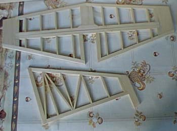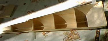 Collez ensuite le coffrage d'intrados (dièdre). Maintenant l'aile commence à prendre forme. Collez les renforts pour les ailerons, et pensez à laisser une ouverture pour la découpe de ces derniers. Maintenant il faut penser au montage des servos et des renforts nécessaires, mais aussi au système d'attache de l'aile. Une fois cela terminé, on peut coffrer l'extrados.