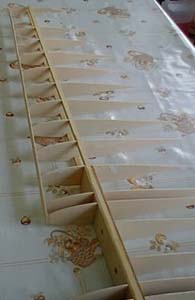 La partie suivante est sans doute la plus délicate, car tout vrillage ne sera plus récupérable. J'assemble tous mes avions sur une planche bien plane, qui me permet de vérifier les alignements, la symétrie, etc. ... A ce stade l'aile n'a pas de rigidité en torsion. Il faudra la maintenir solidement a la surface de référence.